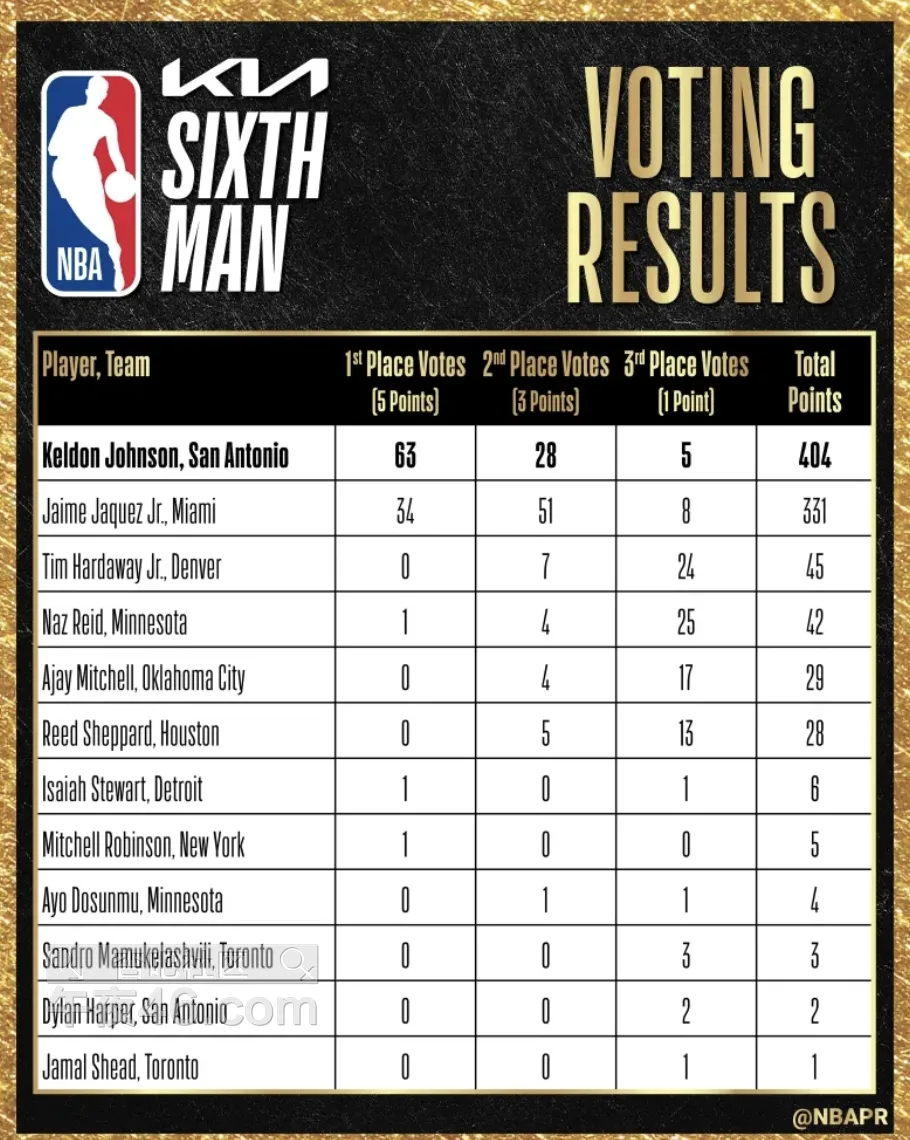 [|篮球赛事] 最佳第六人投票详情:凯尔登63张第一选票,哈克斯34张次之 |